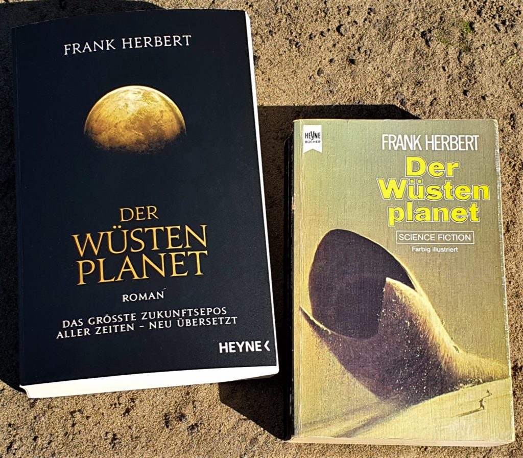„Der Wüstenplanet“ ist derzeit sowohl in neuer Übersetzung von Jakob Schmidt als auch in der älteren und bekannteren Übersetzung von Roland M. Hahn erhältlich. Die verschiedenen Übersetzungen des Romans unterscheiden sich erheblich und haben einen großen Einfluss auf die Rezeption des Werkes. Gerade die in Satzkonstruktion und technischem Vokabular gediegenere, altertümlicher anmutende Übersetzung von Roland M. Hahn passt meiner Meinung nach allerdings sehr gut zu dem posttechnologischen, feudalen Dune-Universum und wird von mir bevorzugt. Sie ist jedoch aus heutiger Sicht etwas ungewohnt und auch nicht ganz einfach zu lesen. Die neue Übersetzung von Jakob Schmidt kommt dagegen erheblich modernisiert und flotter, vielleicht jedoch ein wenig zu glatt daher. Sie ist in jedem Fall aber eingängig und zeitgemäß. Nachfolgend eine kleine Verdeutlichung durch Gegenüberstellung beider Übersetzungen: